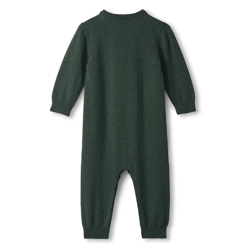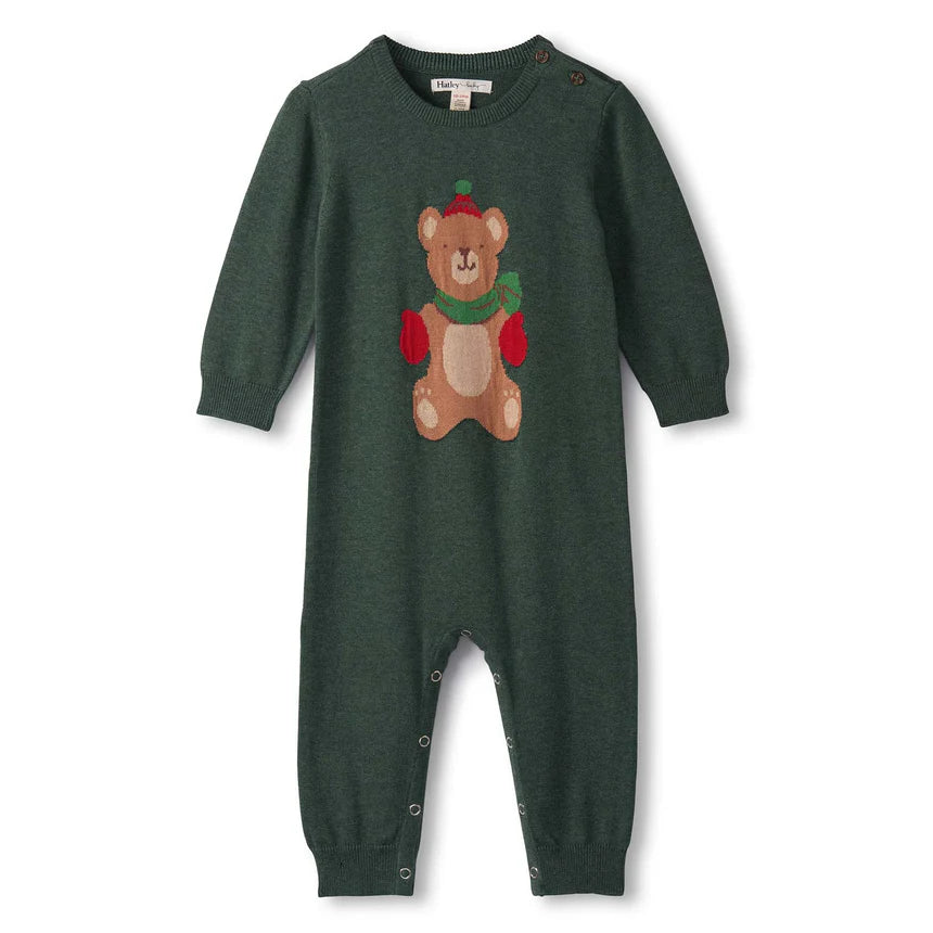 Wrap your little one in cozy charm with the Baby Boys Teddy Bear Sweater Romper in deep green. Crafted from 100% cotton yarn, this long-sleeve knit features a delightfully detailed teddy bear wearing a scarf, mittens, and a little hat. Thoughtful touches like ribbed cuffs, a crew neckline, and snap closures at the leg inseams make diaper changes a breeze, while the two-button shoulder placket ensures easy dressing.
