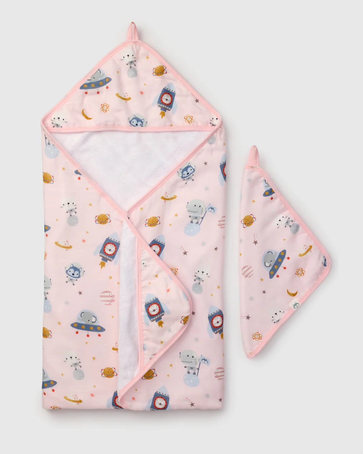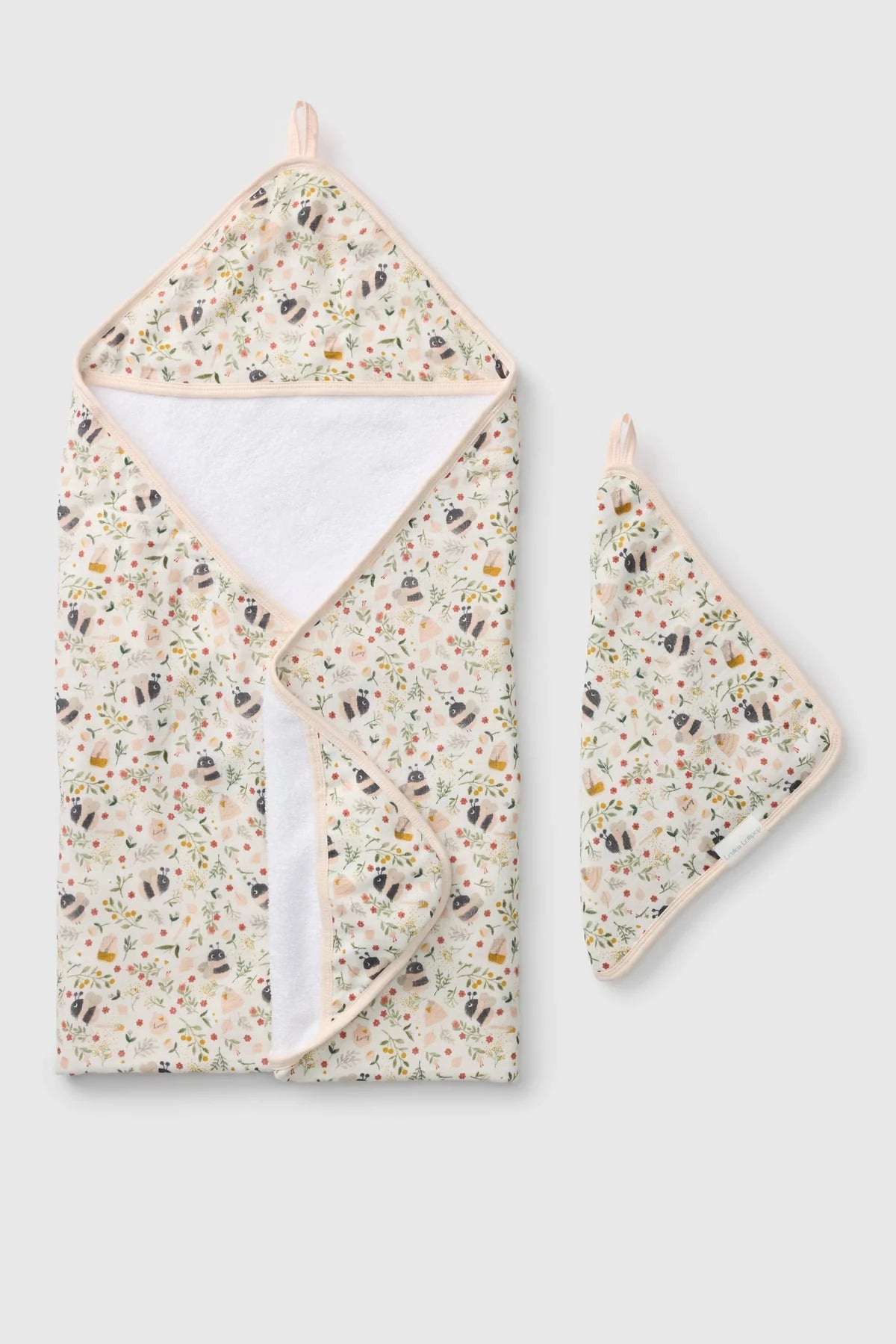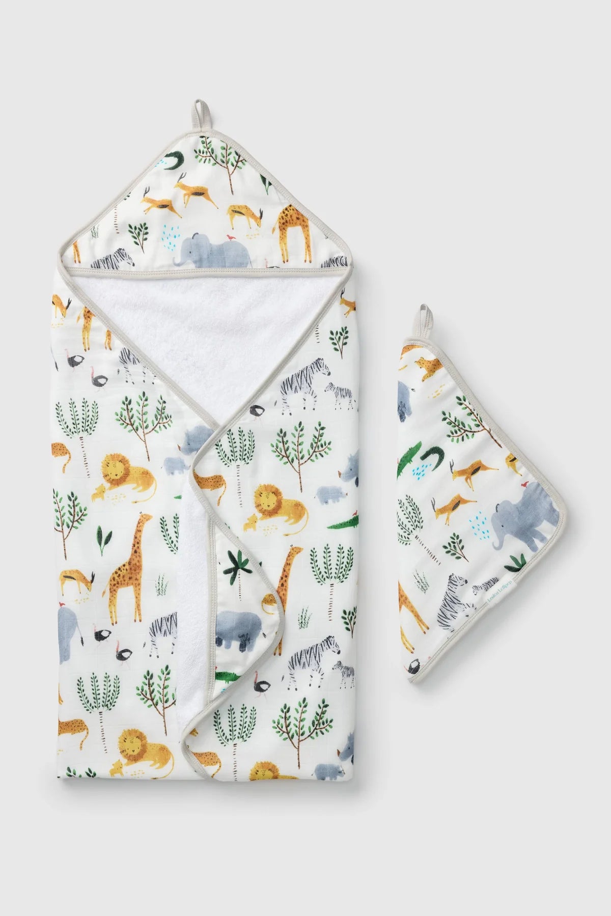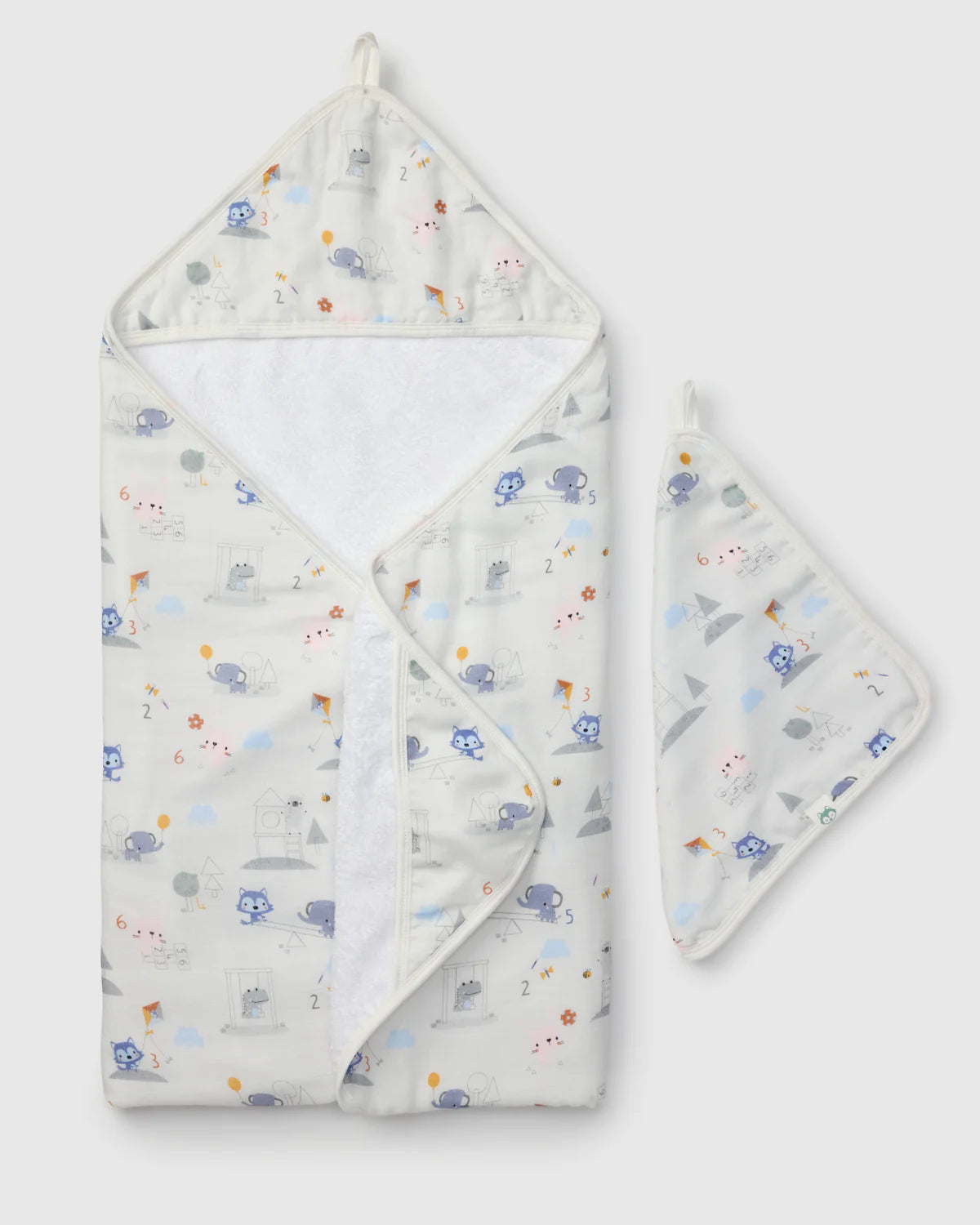 Hooded towel measures 32" x 32", and washcloth measures 12" x 12".
