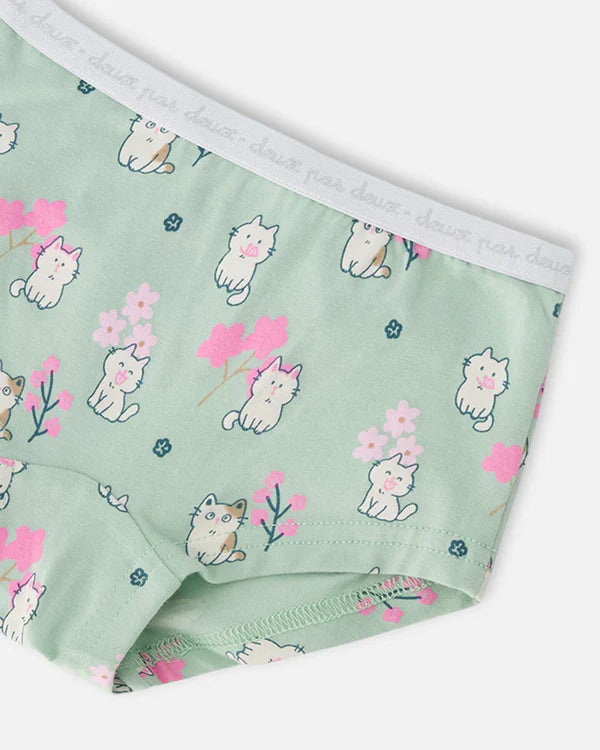 This pack of three boyshort panties brings together fun prints and everyday comfort. One panty features a playful lilac ice cream pattern, another is covered in cheerful kittens on a green background, and the third shows delicate blossoms on a pale pink base. Made with soft organic cotton and a touch of stretch, this set is designed to move with her all day long.