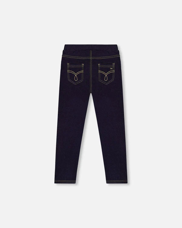 The navy blue denim jeggings are a stylish staple with the look of jeans and the comfort of leggings. These bottoms feature a slim fit, front pockets, and two jeans-style back pockets, all paired with a comfy elastic waistband. Made from a soft viscose blend with added stretch, they bring style, comfort, and practicality to girls and baby girls.
