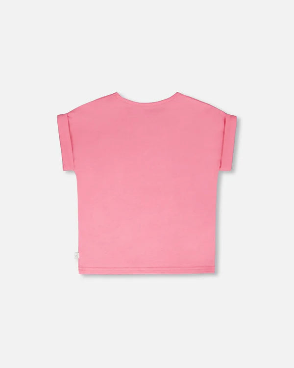 Our organic cotton jersey t-shirt in pink is a cheerful summer staple with a playful vibe. This top features a round neckline, short sleeves with folded cuffs, and a charming front print of a beach chair under an umbrella with seaside details. Soft and stretchy for all-day comfort in organic cotton