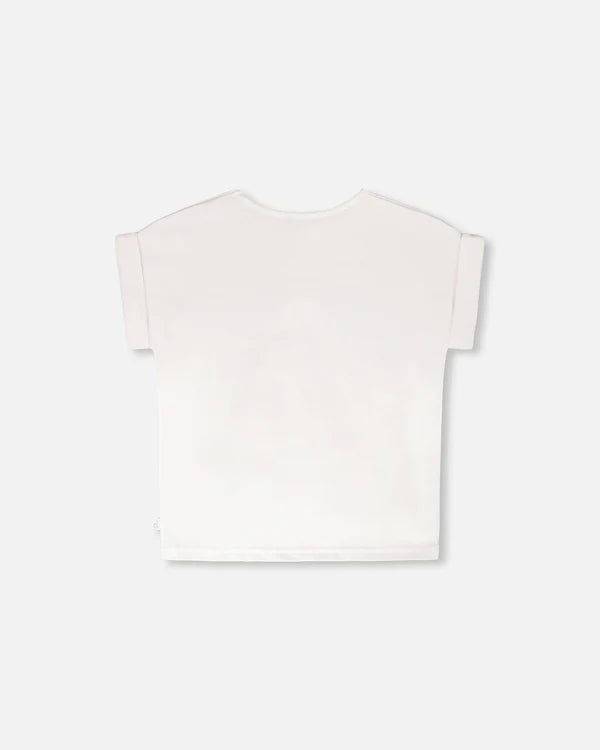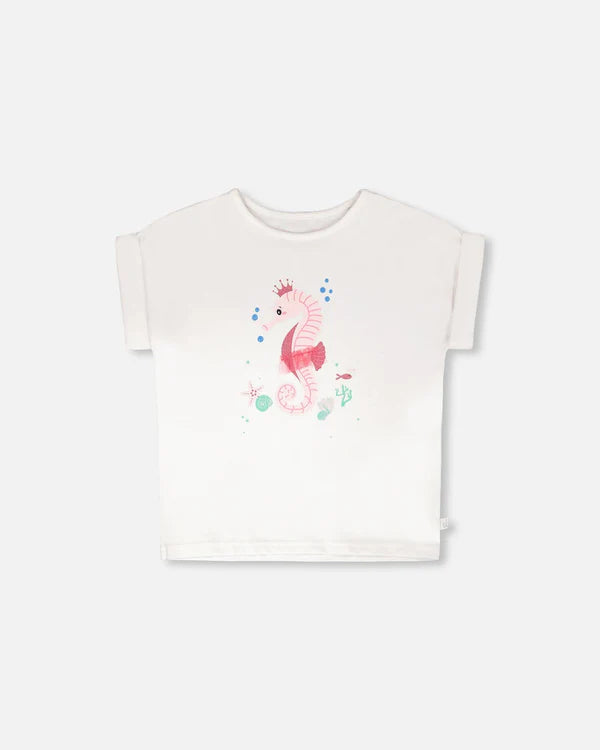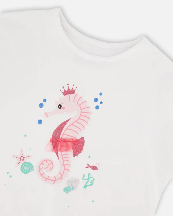 Our organic cotton jersey t-shirt in white is a playful staple with a whimsical twist. This top features a round neckline, short sleeves with folded cuffs, and a charming front print of a seahorse wearing a crown surrounded by bubbles and corals. Soft and stretchy for all-day comfort in organic cotton, this tee is easy to coordinate with bottoms from our "Blue Horizon" collection. Sizes 2 and 3 years are designed without detachable 3D embellishments to ensure young children’s safety.