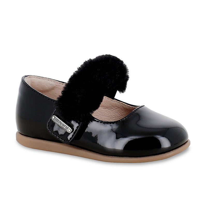 Shoe made from sustainably sourced tanned leather. Mary Jane style shoes for girls, a classic and timeless style to go with elegant outfits. Patent leather effect outer material. Footwear with leather lining and insole. All our shoes are made with chrome-free leather. Lightweight and flexible rubber sole. Adjustable velcro strap which guarantees a perfect fit.