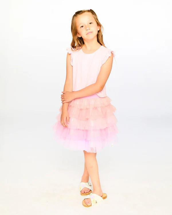 This bi-material dress in pale pink is both playful and elegant. The soft fitted bodice features delicate flutter sleeves, while the skirt steals the show with cascading ruffled tiers in sheer layered mesh fabric. A comfortable lining ensures ease of movement, making it perfect for special celebrations.