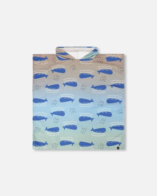 Wrap up the fun after a swim with this hooded beach towel in blue with whale print, designed to keep kids cozy and dry. This beach accessory is covered in an allover whale motif on a blue gradient background, which brings a playful ocean vibe, while the attached hood adds extra warmth and coverage. Made from soft polyester, it’s lightweight, absorbent, and easy to pack for every seaside adventure.