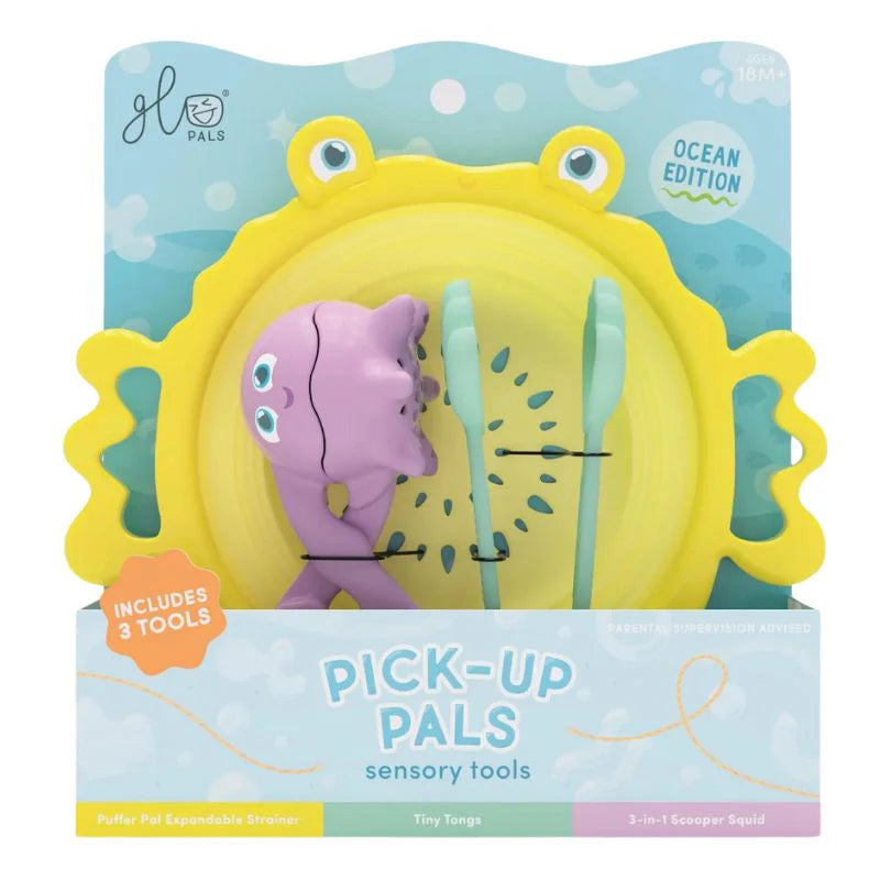 Includes 3 sensory tools: Puffer Pal Expandable Strainer, "Clamp" Shell Tiny Tongs, and a 3-in-1 Scooper Squid!