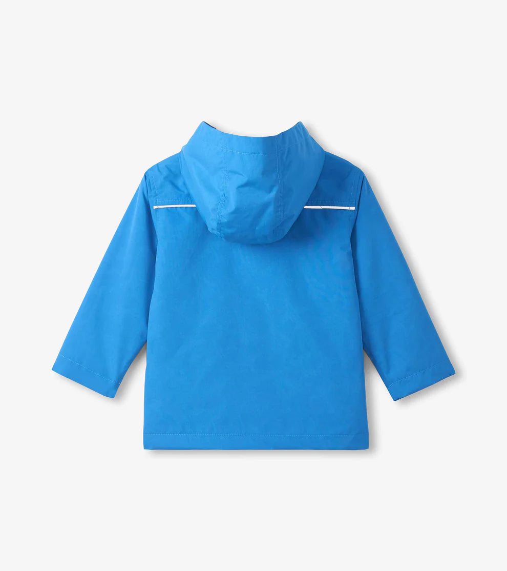 Watch the magic as hidden aircrafts appear in the rain on this amazing color-reveal jacket. Waterproof polyester construction keeps him dry while the cozy lining provides warmth. A reflective safety stripe on the back adds visibility for outdoor adventures. Secure snap pockets protect valuables from unexpected showers. The vintage aircraft design transforms from subtle to spectacular when wet.