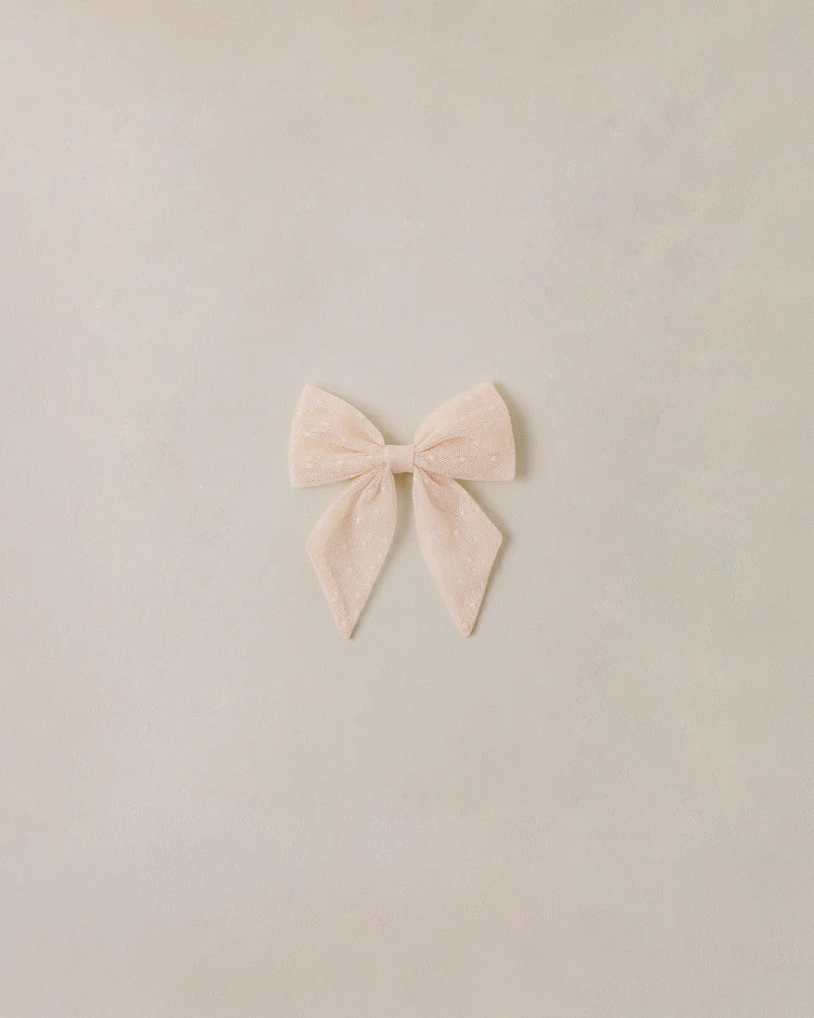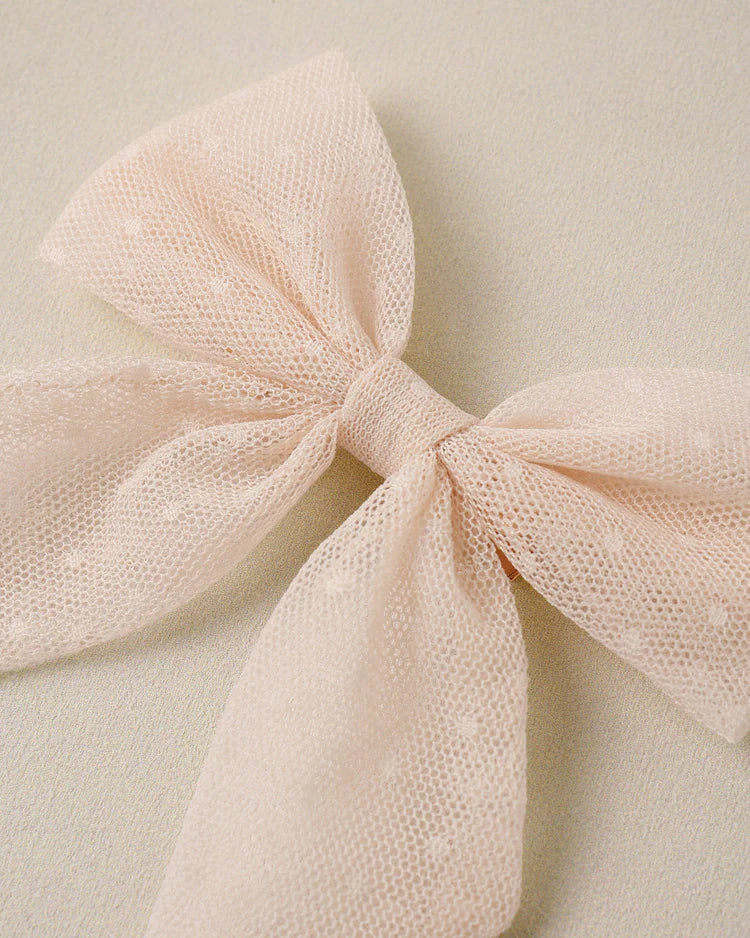 A sweet organza bow attached to a rose gold alligator clip for easy wear.