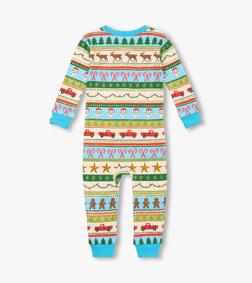 Celebrate the season in style with the Baby Boys Blue Fun Fair Isle Cotton Sleeper, crafted from 100% cotton for cozy, breathable comfort. This footless, snug-fitting sleeper features a festive array of Christmas trees, reindeer, candy canes, Santa faces, gingerbread men, and classic red trucks, arranged in cheerful stripes of red, green, blue, and gold. Designed with a round neckline, long sleeves, and blue cuffs at the wrists and ankles, it’s finished with a front zipper that runs from neck to leg for easy, stress-free changes. The interior zipper guard and top snap closure ensure extra safety and comfort, making this sleeper as functional as it is merry.