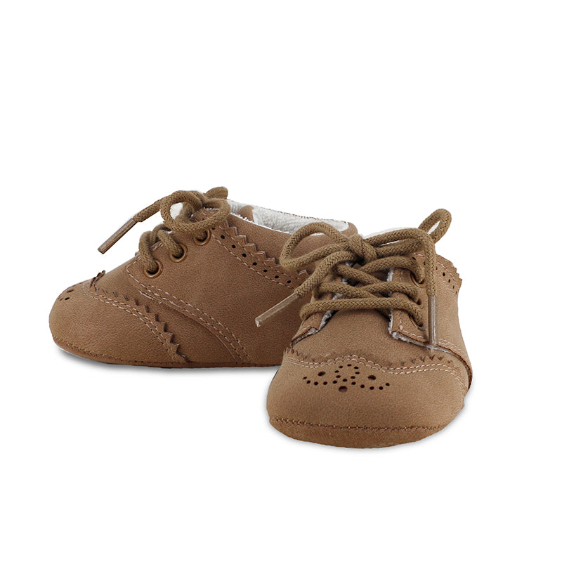 Dress shoes for newborn baby boy ideal for the most elegant moments without compromising comfort. Leather effect outer material. Shoes with inner lining and breathable cotton insole. Non-slip rubber sole to strengthen the grip when walking. Shoelaces to fasten for a tighter fit around the foot. Decorative openwork motifs. This item is sent in a box from the Newborn collection, ideal to be given as a gift on special occasions.