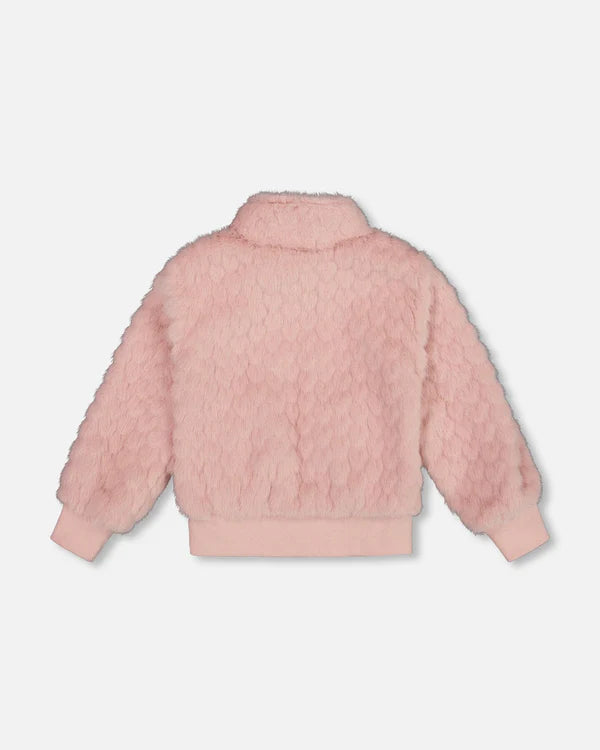The Faux Fur Jacquard Jacket Dusty Pink is cozy, cuddly, and irresistibly cute. Made from soft faux fur with a textured jacquard pattern, this zip-front jacket features side welt pockets, ribbed cuffs and hem, and a high collar to keep the chill out. Perfect for bundling up in style, it adds playful warmth to any outfit.
