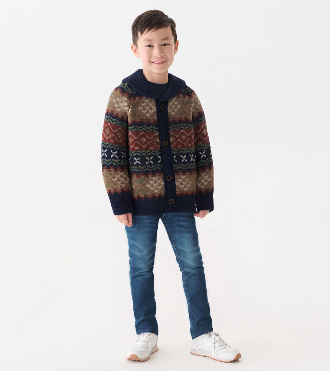 Give his winter style a vintage twist with the Boys Vintage Fair Isle Shawl Collar Cardigan in Blue! Crafted from a soft cotton blend yarn, this cozy cardigan features a classic red, blue, white, and grey Fair Isle pattern with a timeless shawl collar. The rich dark blue accents at the collar, button placket, cuffs, and hem bring bold contrast, while the four brown buttons and elasticated cuffs offer snug comfort.