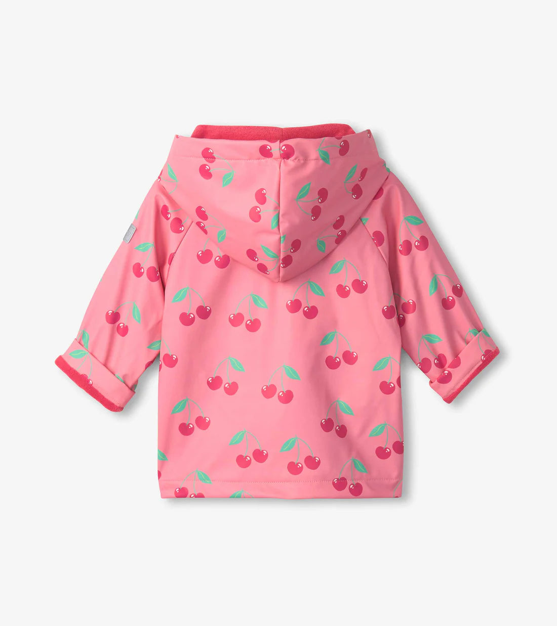 Add a touch of sweetness to rainy days with the Baby Girls Cherries Button-Up Rain Jacket! Made from water-resistant polyester, this jacket features playful cherry graphics that stand out on gray days. Lightweight and breathable, it’s designed for comfort with a practical button-up front. A charming way to keep her dry and happy.