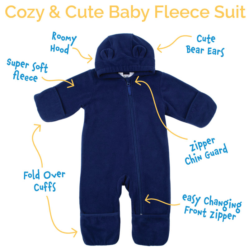 Fold-over feature to keep hands and feet warm; convenient front zipper for easy changing; attached hood with adorable bear ears.