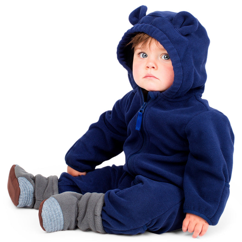 Fold-over feature to keep hands and feet warm; convenient front zipper for easy changing; attached hood with adorable bear ears.