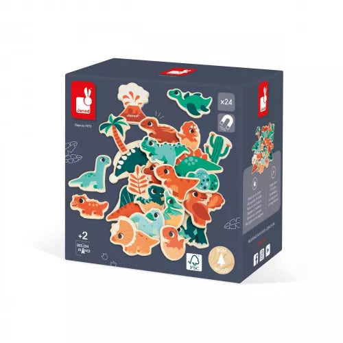 Children will love to travel back in time and recreate lots of prehistoric scenes with this pretty set of dinosaur magnets, complete with nature-related decorative elements! Which one do kids love best? The spinosaurus, stegosaurus or pteranodon? The species depicted on these magnets are all as cute as one another with their big eyes and soft features. These magnets will stick to all magnetic surfaces (e.g. magnetic boards), are easy to transport and can be removed and repositioned time and time again. This set of 24 wooden magnets helps develop the imagination and dexterity of children aged 2 years and up, whilst they’re having fun. These dinosaur magnets are made from FSC® wood.