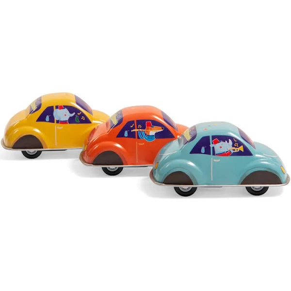 Assortment of small metal yellow, blue and orange friction cars decorated with a cheerful brass band on their way to a concert. Roll the car forwards and backwards pressing down slightly, then let go... and watch it take off at top speed! Measures approximately 8.5 x 4.5 x 4 cm. For ages 3+.